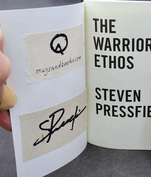Collectors Edition Book: Two bookplates, made from handmade paper by Sienna Cherrico, were mounted in the inside cover by the Cherrico Pottery Team, using archival glue. One bookplate signifies the book as a Collectors Edition, exclusively available here on mugsandbooks.com It bares an insignia that matches the mug. The second bookplate was sent to Steven Pressfield, autographed, then mounted in your book.