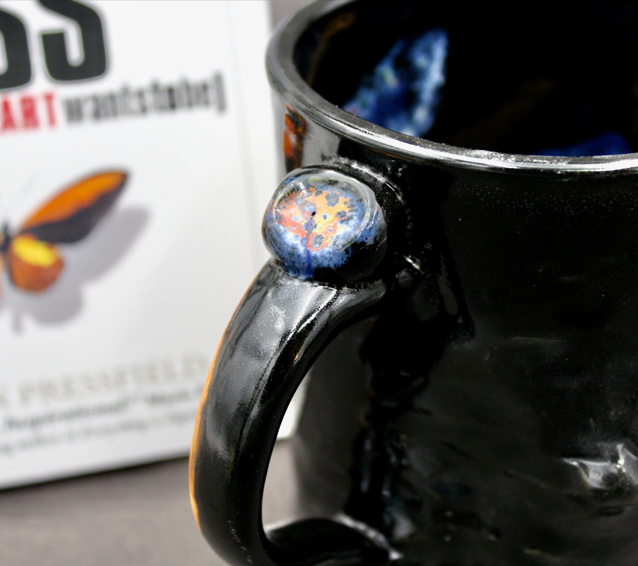 Mugs are glazed with 9 different colors. The mug interior is inspired by a spinning galaxy, created by layering custom glaze chemistry and kiln firing to 2280 degrees F. to create a 100% food safe, non-toxic mug that is meant to be used and enjoyed. Handle thumb spot is also inspired by a galaxy of cosmic colors.