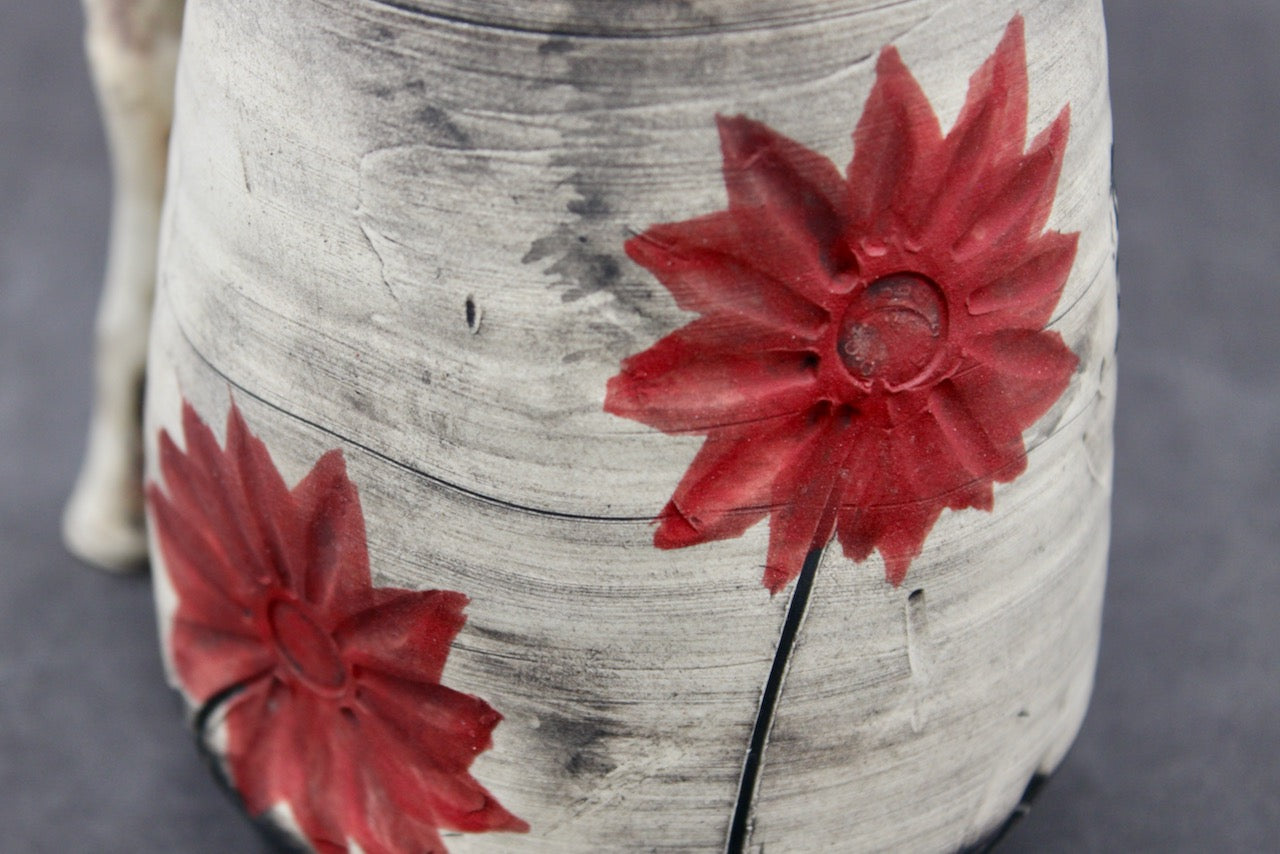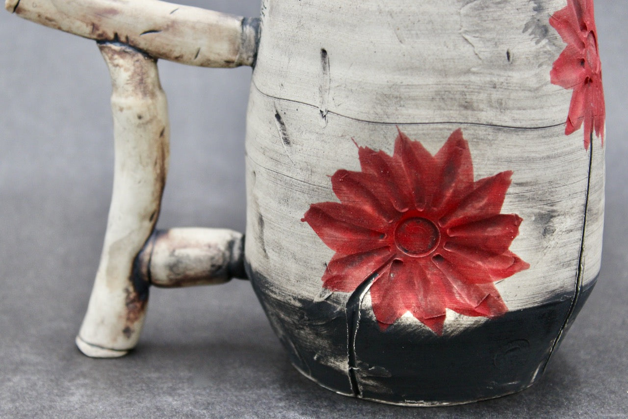 Roughly 14-16oz. size mug, Stoneware, handmade by Joel Cherrico on his pottery kickwheel. Handle was sculpted, inspired by a bullet casings in the shape of a sacred Torii archway. Flower texture was pressed into soft clay with a .30-06 Springfield bullet, inspired by using violence and chaos to instead create beauty.