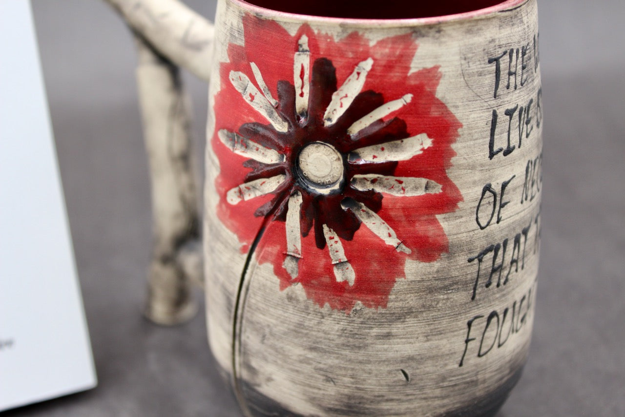 Roughly 14-16oz. size mug, Stoneware, handmade by Joel Cherrico on his pottery kickwheel. Handle was sculpted, inspired by a bullet casings in the shape of a sacred Torii archway. Flower texture was pressed into soft clay with a .30-06 Springfield bullet, inspired by using violence and chaos to instead create beauty.