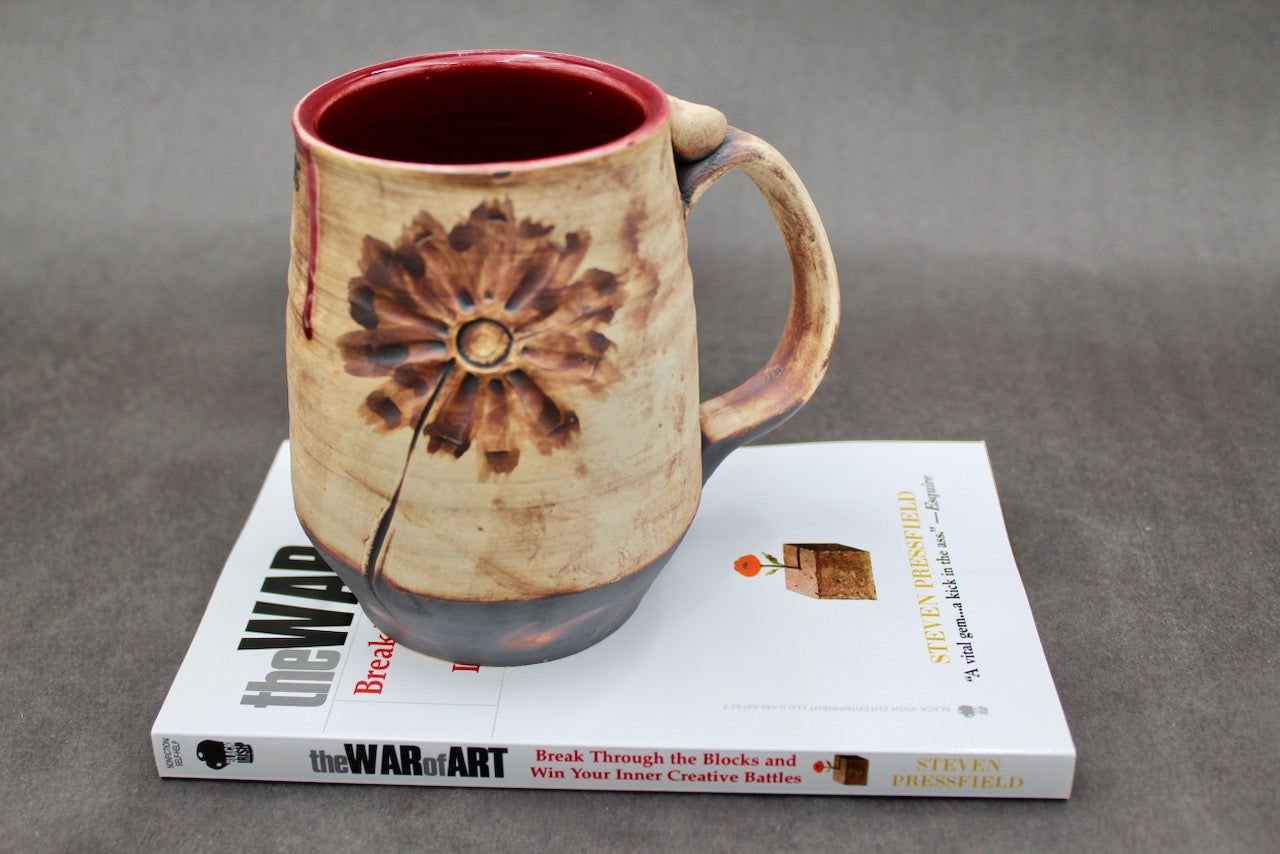 Roughly 14-16oz. size mug, Stoneware, handmade by Joel Cherrico on his pottery kickwheel. Flower texture was pressed into soft clay with a .30-06 Springfield bullet, inspired by using violence and chaos to instead create beauty.