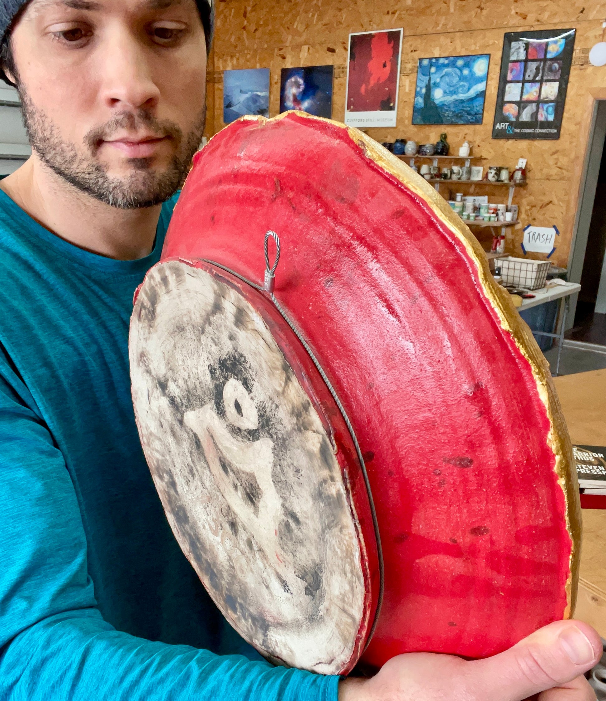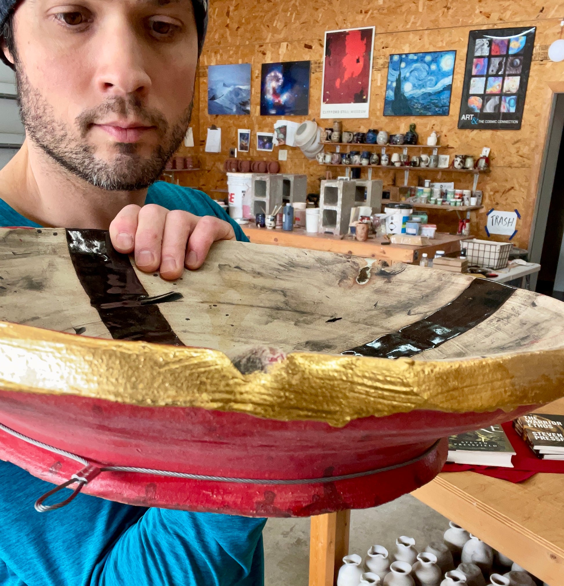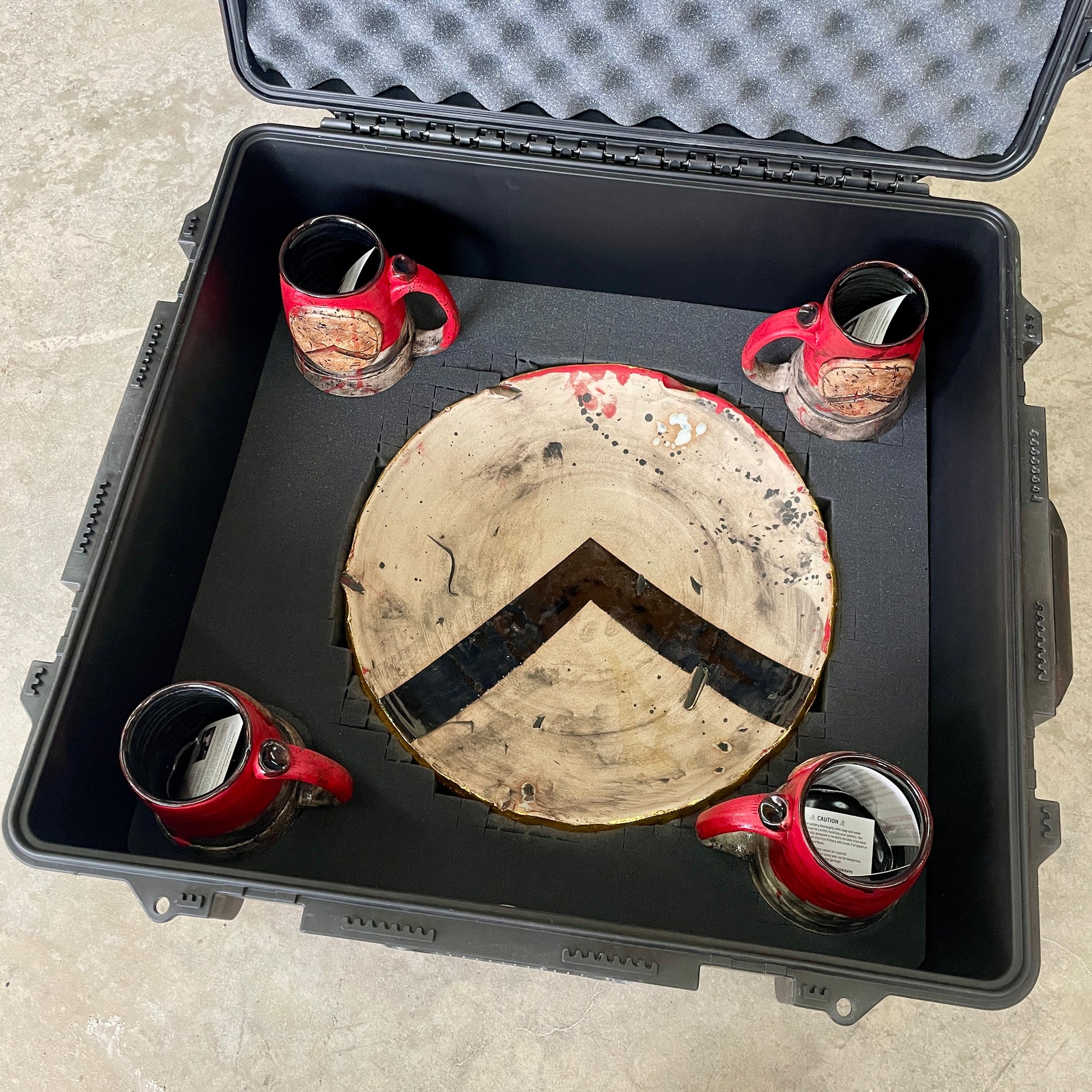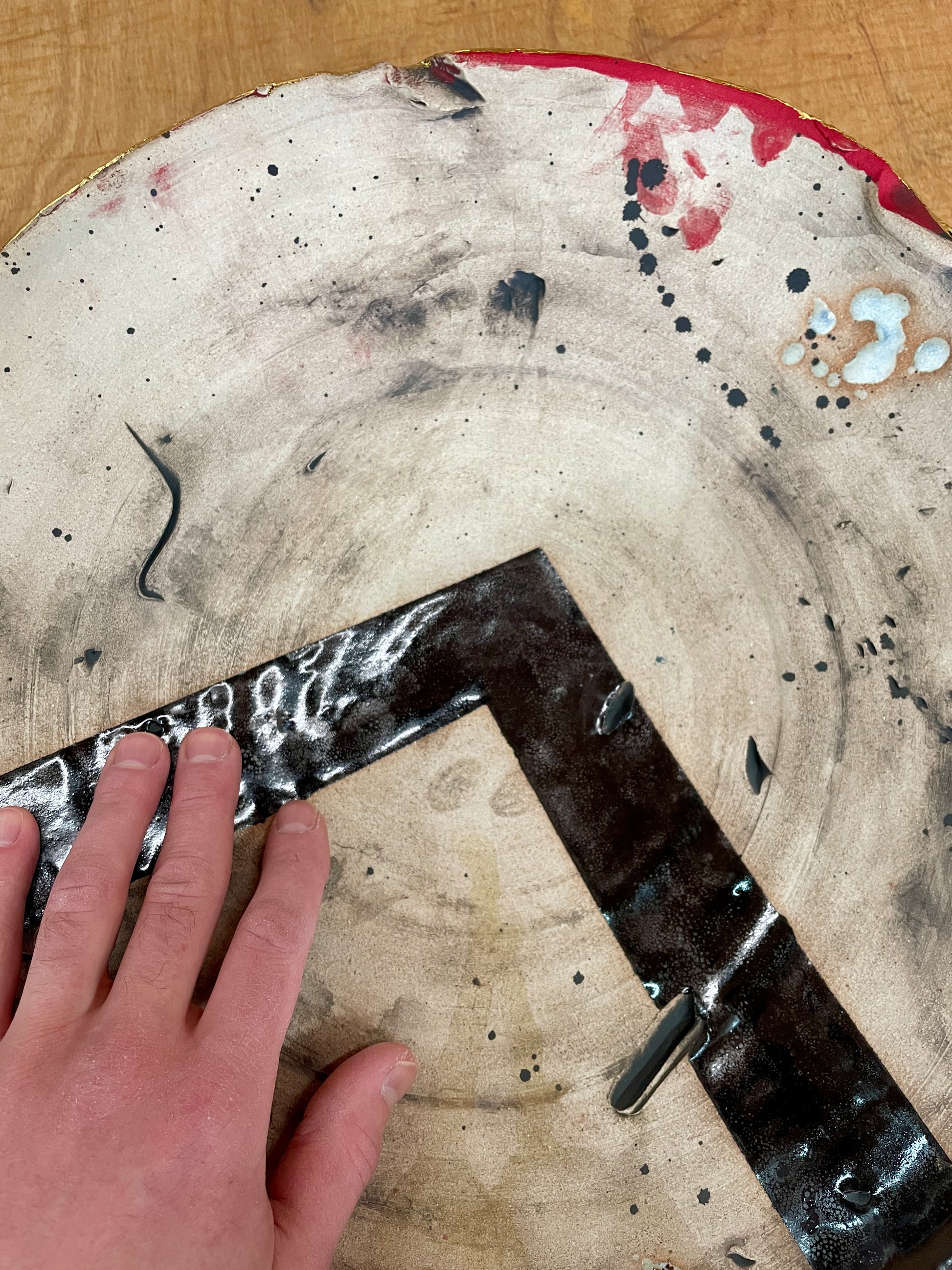 I (Joel Cherrico here) created this platter after reading "Gates of Fire." I wanted the interior of the platter to reference the interior of a Spartan shield, as described by Steven: coved in blood, spit, piss, shit and dirt. My aesthetics subdue these gory details, but I want them to reference the reality of our human history.